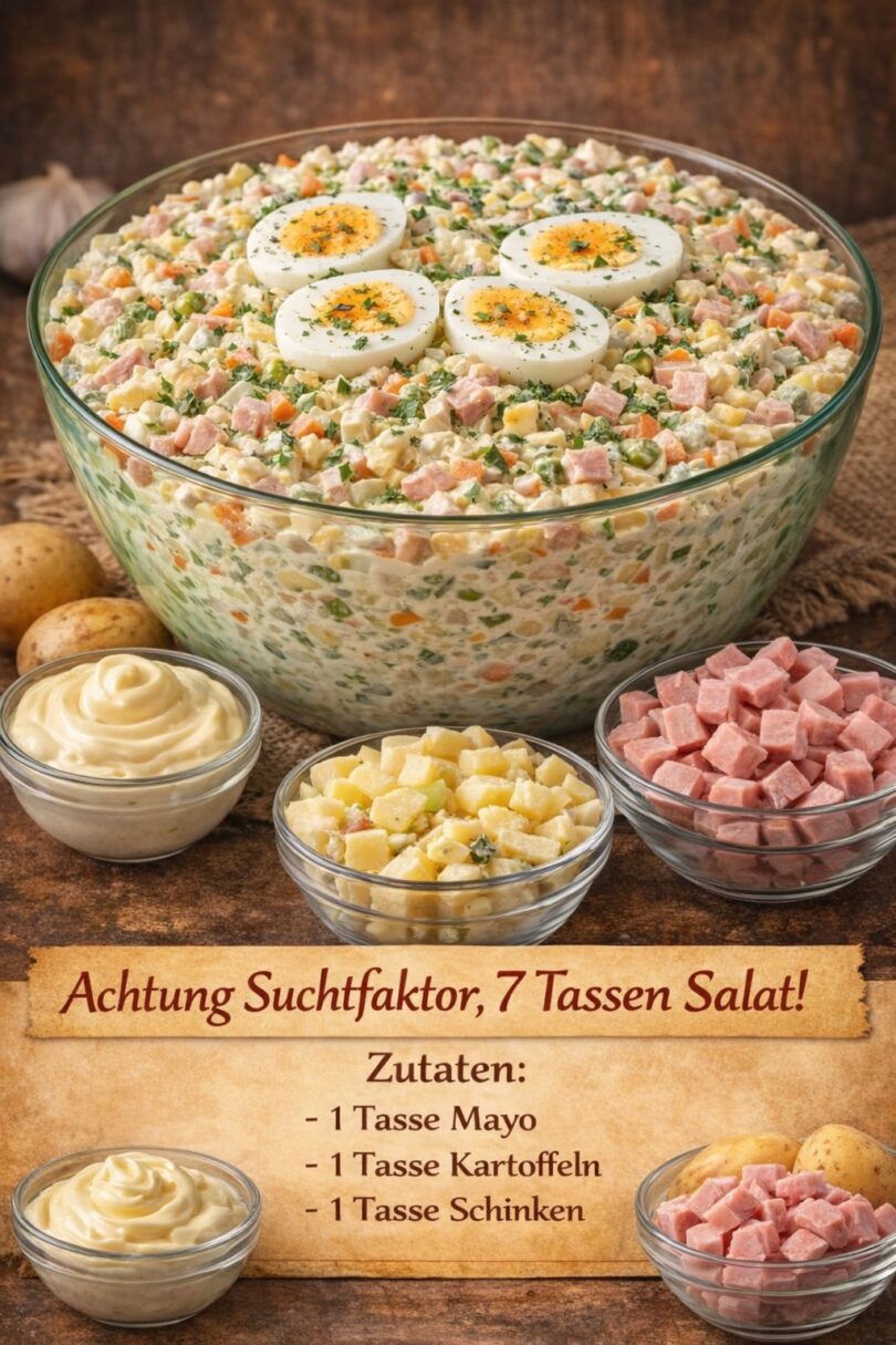 Cremig, herzhaft und blitzschnell gemacht: Dieser 7-Tassen-Salat ist ein echter Partyklassiker. Jede Zutat wird ganz einfach abgemessen – unkompliziert und absolut gelingsicher.