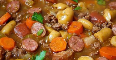 Genussvoller Linseneintopf mit Gemüse und Würstchen – Ein...