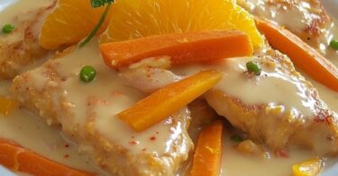 sautierte Schweinefleischstreifen mit Karotten- und Orangensauce