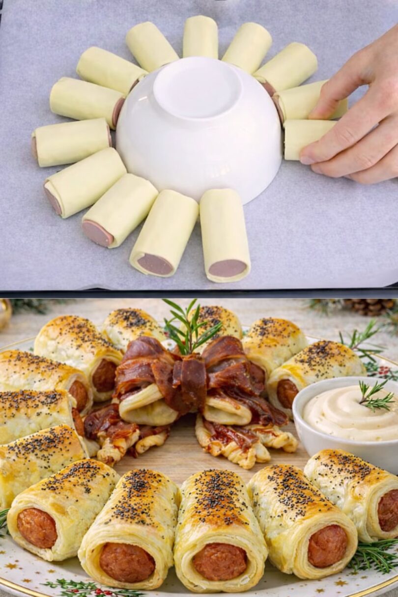 Dieser Wurstkranz ist das Highlight auf jeder Party oder festlichen Tafel: knuspriger Blätterteig, saftige Würste, aromatischer Prosciutto und eine elegante Schleifen-Dekoration – einfach ein echter Augenschmaus und Gaumengenuss zugleich 😍