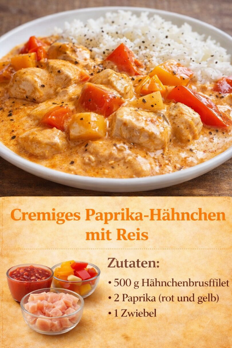 Zartes Hähnchenfleisch in einer wunderbar cremigen Paprikasauce, dazu lockerer Reis – ein unkompliziertes Wohlfühlgericht für jeden Tag.
