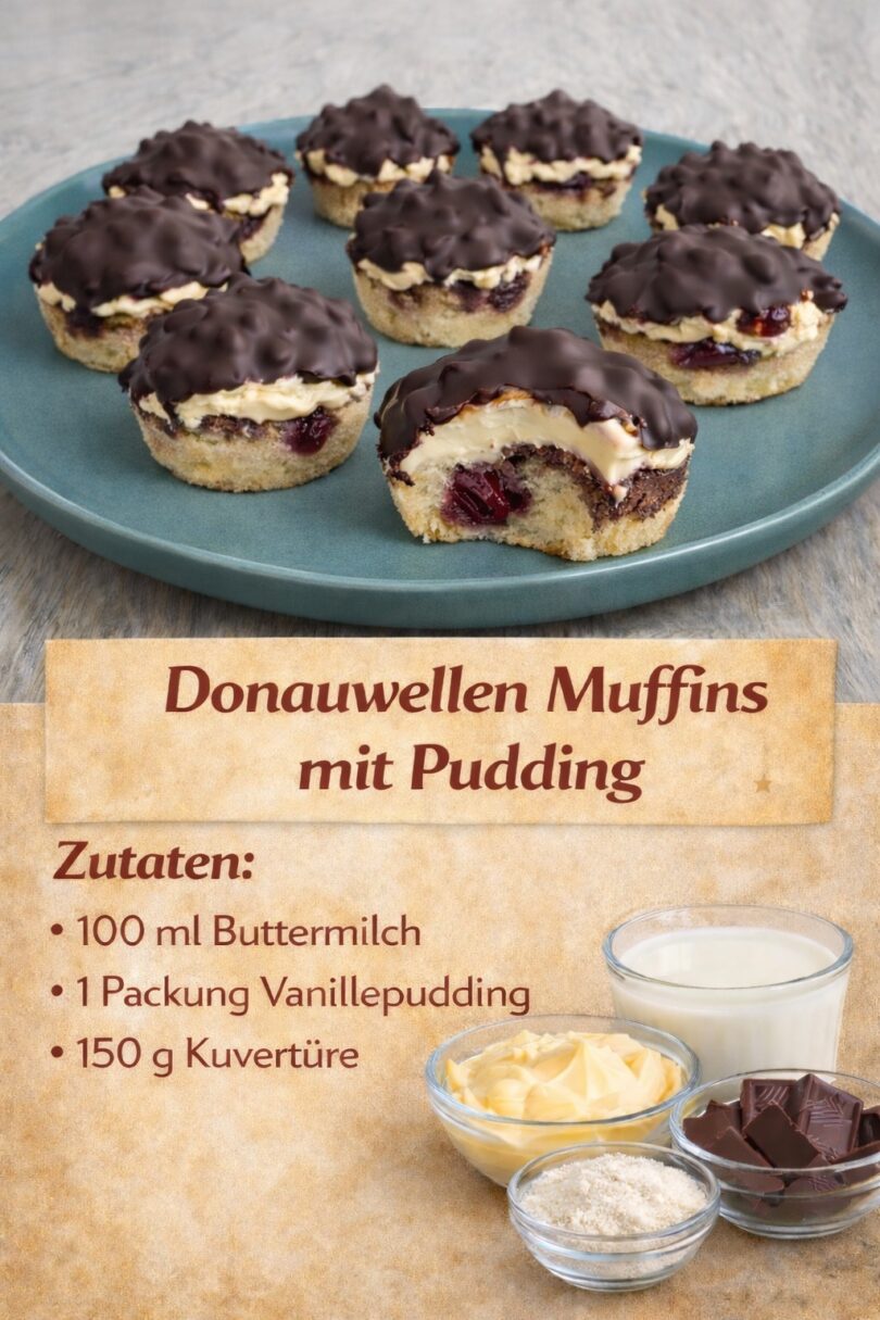 Saftige Muffins mit hellem und dunklem Rührteig, fruchtigen Kirschen und einer cremigen Vanillepudding-Schicht – ein echter Klassiker im Muffinformat.