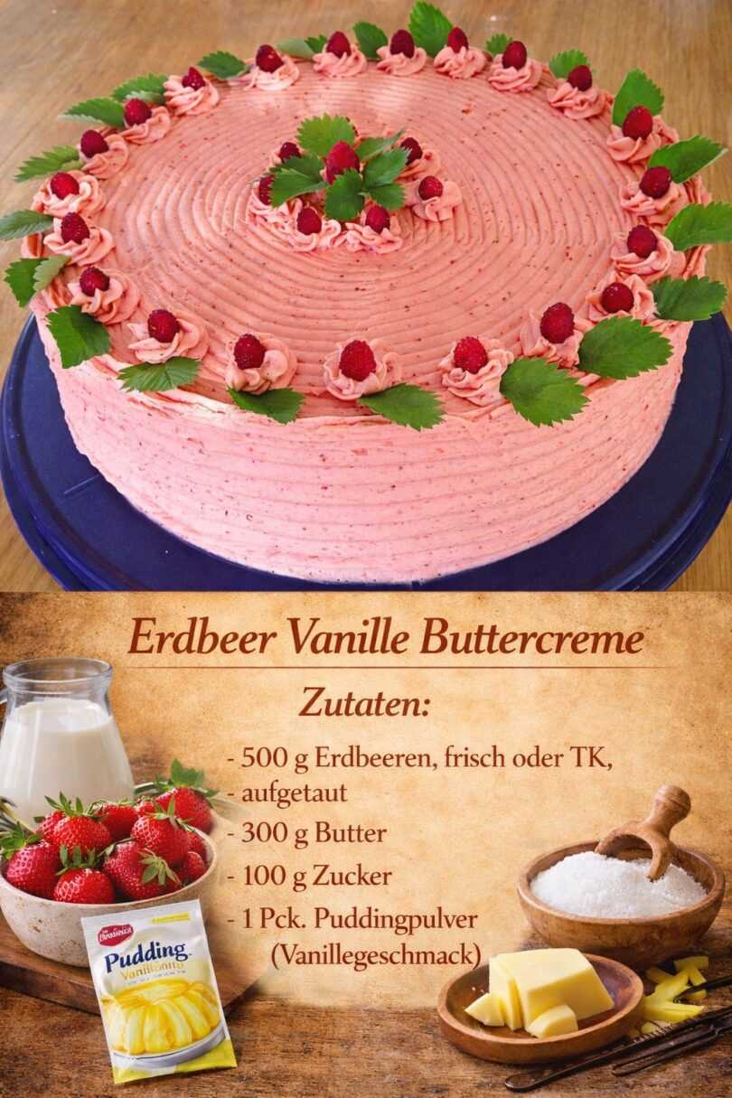 Diese Erdbeer-Vanille-Buttercreme verbindet die Süße und Frische von Erdbeeren mit zarter Vanille und cremiger Butter. Sie ist ideal zum Füllen und Verzieren von Torten oder Cupcakes und bleibt dabei angenehm leicht und aromatisch.