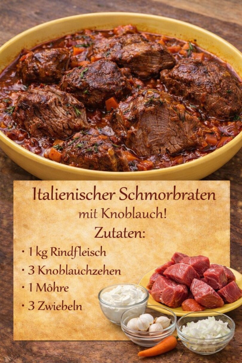 Zart geschmortes Rindfleisch in einer aromatischen Sauce mit viel Knoblauch, Gemüse und mediterranen Kräutern – ein herzhaftes Gericht für gemütliche Familienessen oder Gäste.