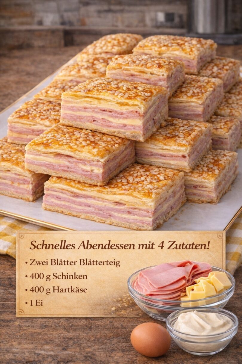 Wenn es mal schnell gehen muss, aber trotzdem richtig lecker sein soll, ist dieses Rezept perfekt. Mit nur vier Zutaten zauberst du ein warmes, herzhaftes Gericht, das sowohl als Abendessen, Snack oder Partyfood überzeugt. Knuspriger Blätterteig, saftiger Schinken und geschmolzener Käse – mehr braucht es nicht für ein richtig gutes Geschmackserlebnis.