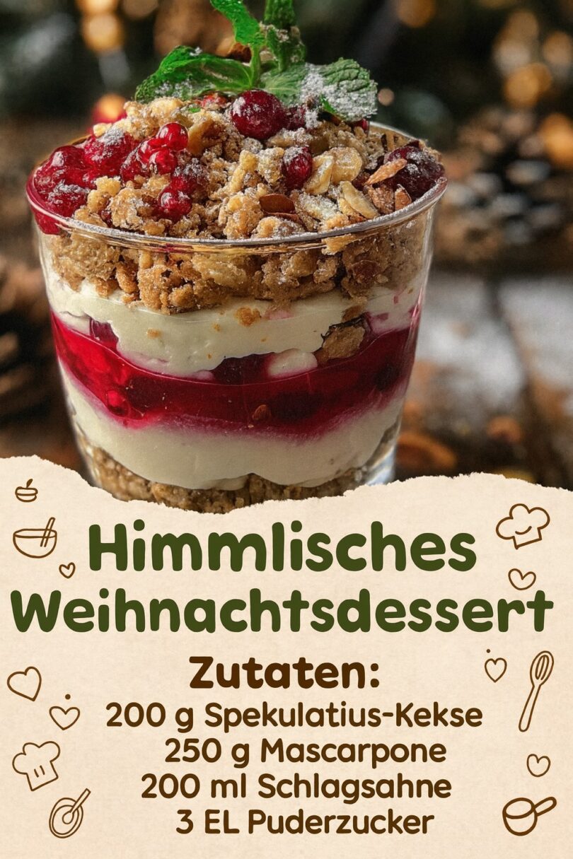 Dieses Dessert ist pure Weihnachtsmagie im Glas! ❤️ Zarte Spekulatiusbrösel, luftige Mascarponecreme und fruchtige Preiselbeeren verschmelzen zu einem traumhaft cremigen Genuss – in nur 10 Minuten zubereitet und perfekt für jede Festtafel! ✨