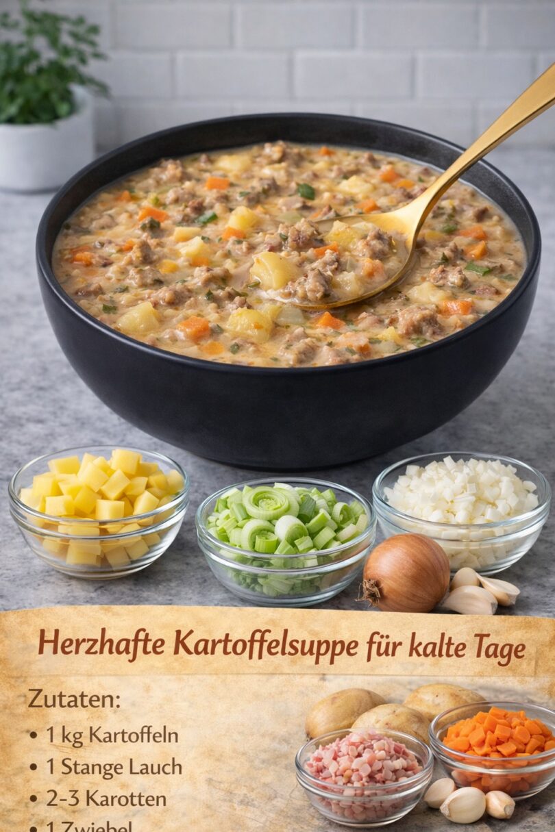 Diese herzhafte Kartoffelsuppe wärmt von innen und ist genau das Richtige für kalte Tage. Cremig, sättigend und voller Geschmack – ein echtes Wohlfühlgericht für die ganze Familie.